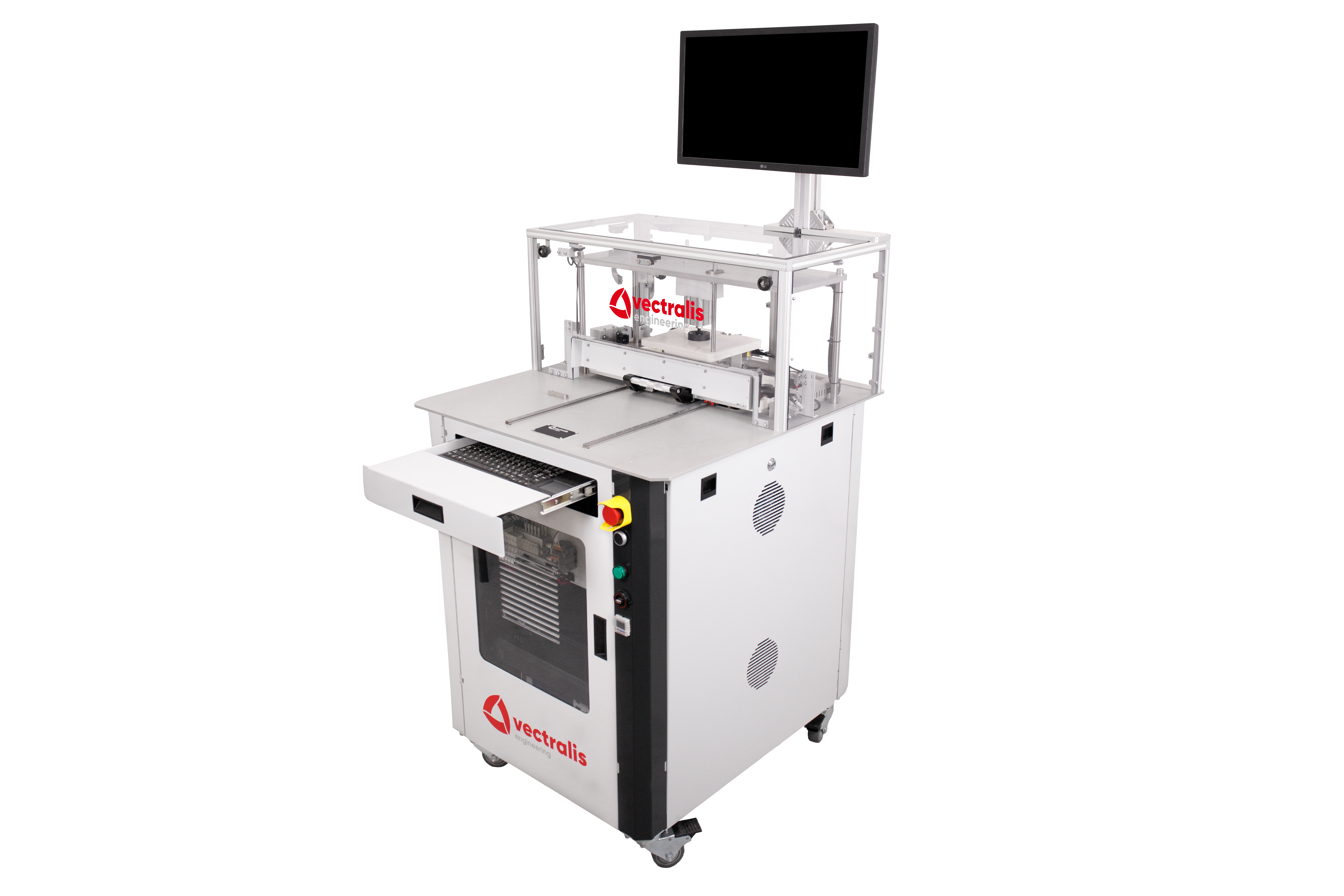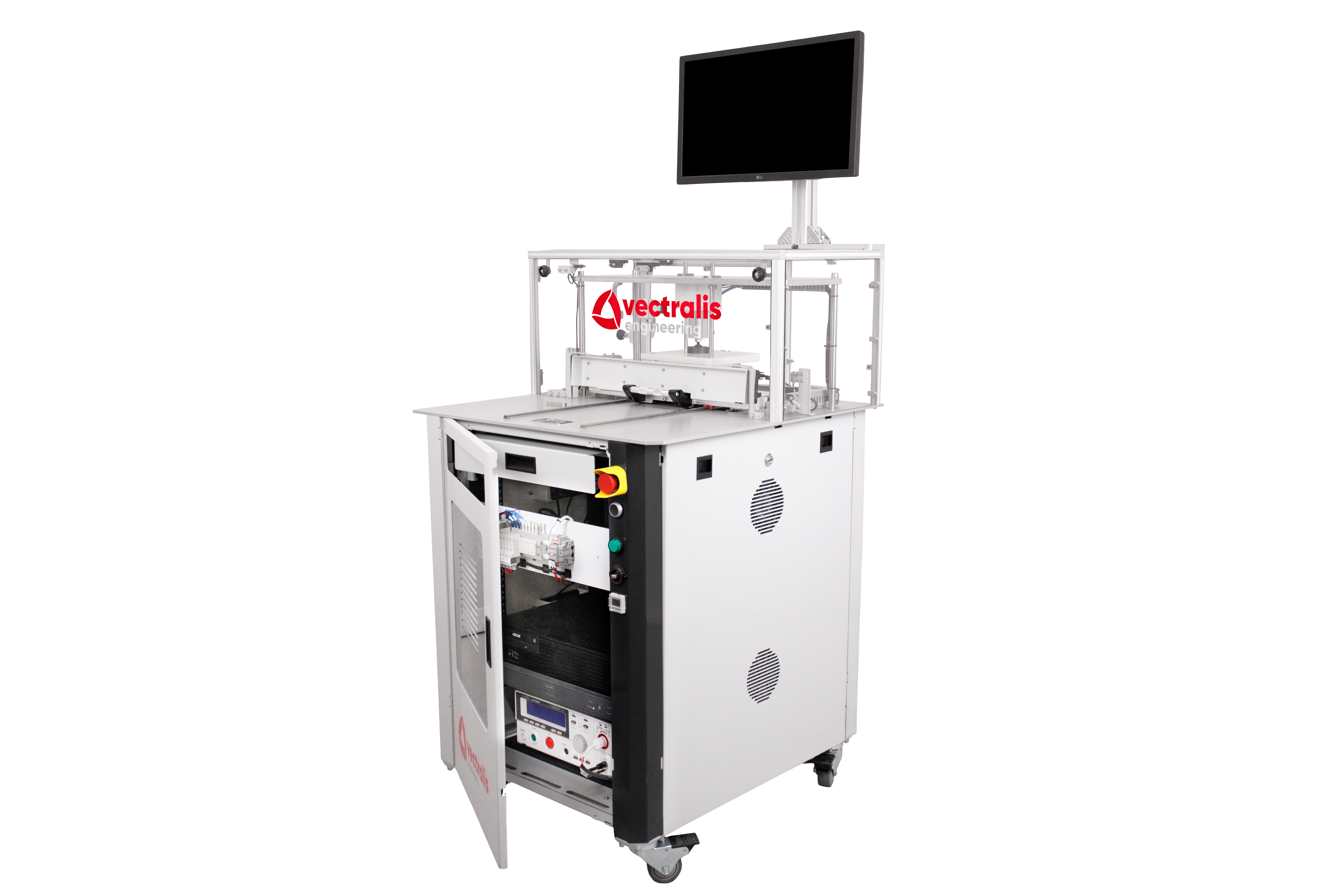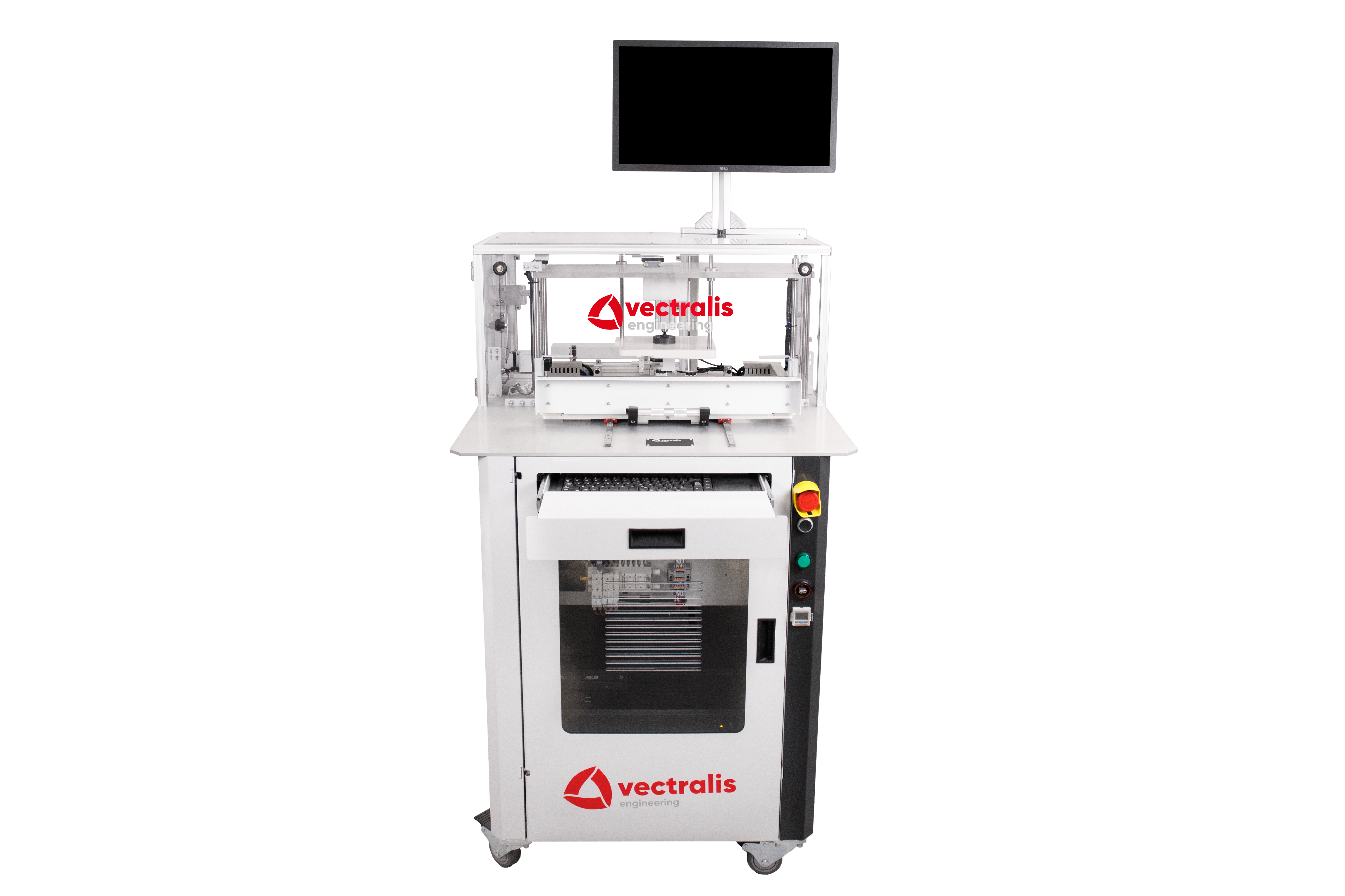 Vectralis automotive test station with extended keyboard tray for operator interface and test control